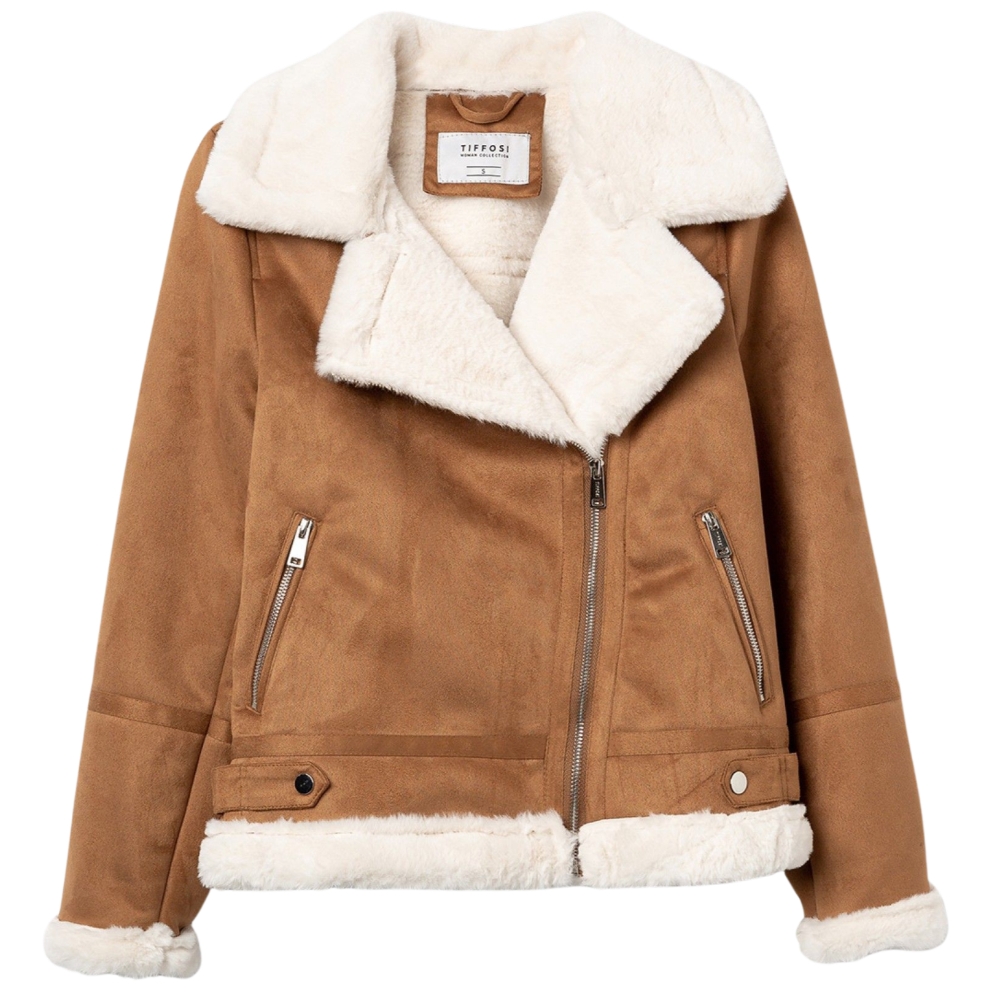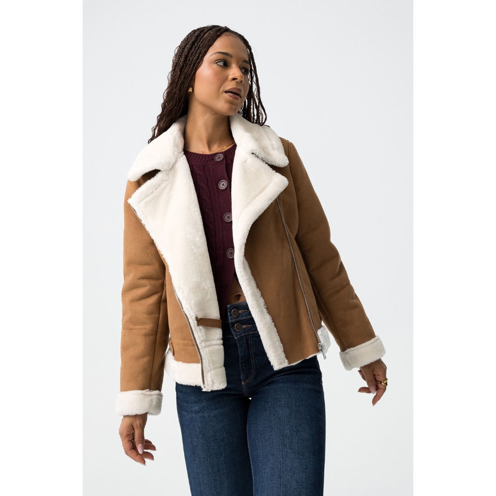 Chaqueta regular fit de efecto ante combinada con pelo sintético, con dos bolsillos delanteros y presillas decorativas. Cuello camisero, cierre de cremallera diagonal y manga larga.