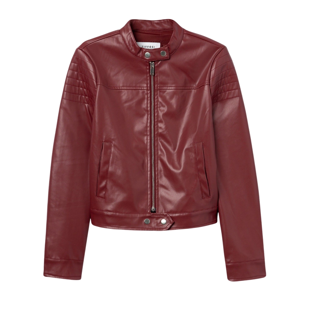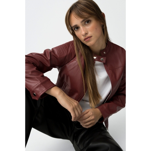 Chaqueta efecto piel regular fit, con cierre de botón de presión en el cuello y dos bolsillos frontales. Apertura frontal con cremallera y mangas largas con botones en los puños.