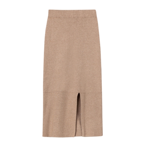 Falda midi de tiro alto con cinturilla elástica. Abertura frontal. Detalle costuras exteriores.