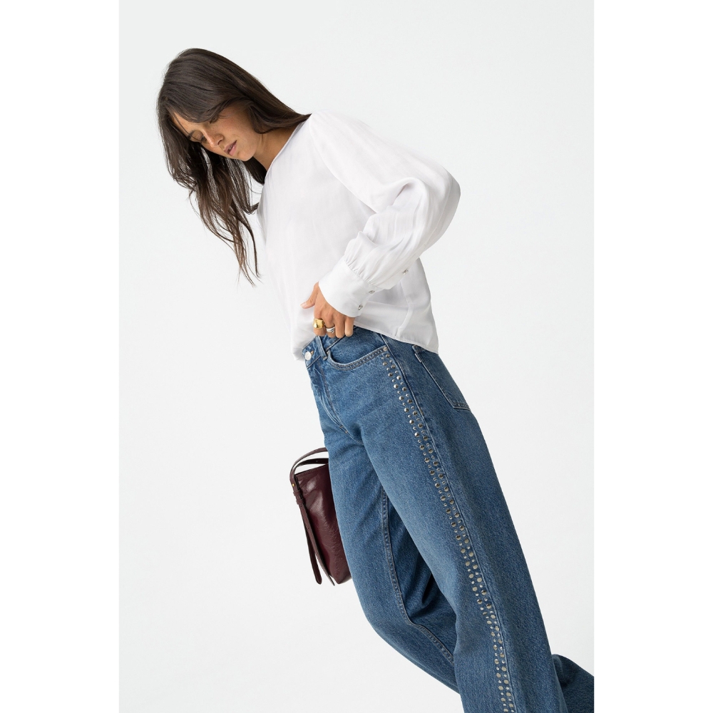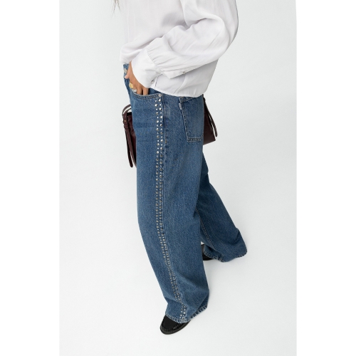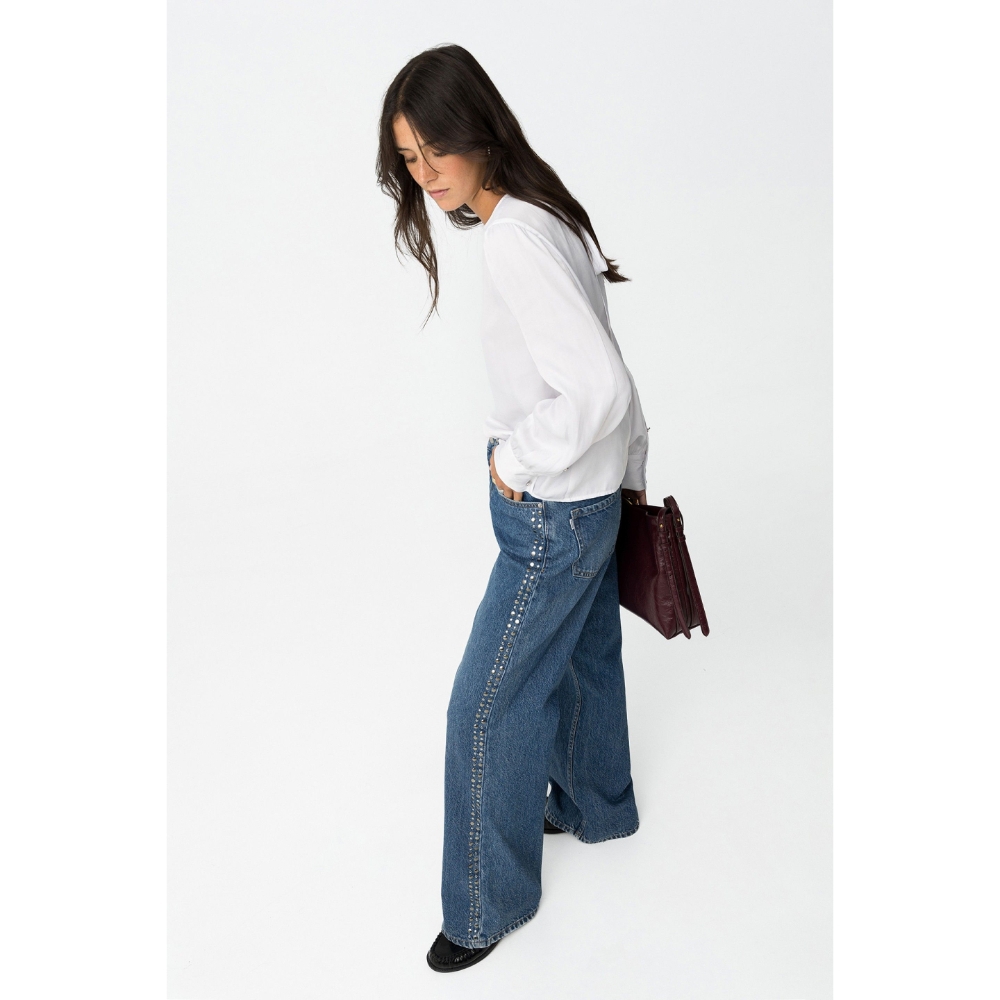 Jeans de pierna ancha con aplicaciones metálicas, cintura alta y cinco bolsillos. Cierre frontal con cremallera y botón metálico.100% COTTON