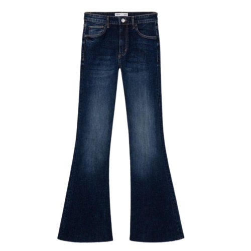 Jeans flare de tiro alto con cinco bolsillos. Cierre frontal con cremallera y botón metálico.