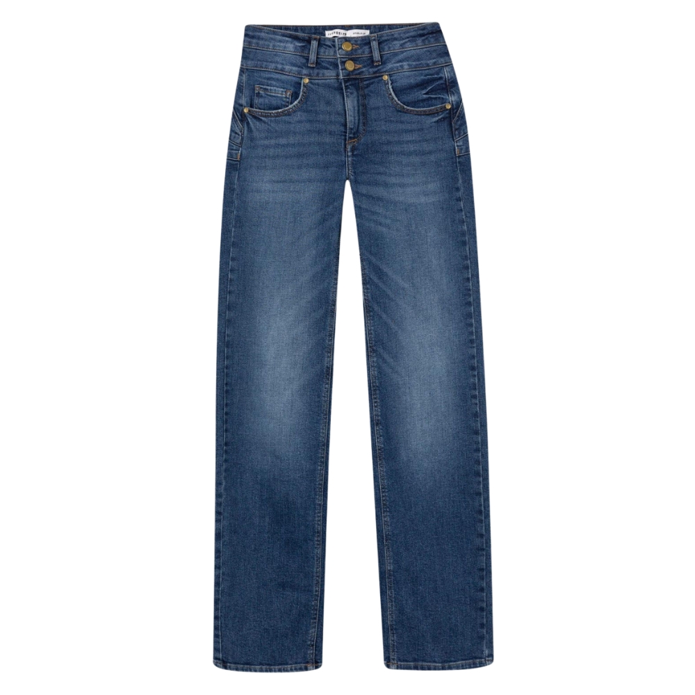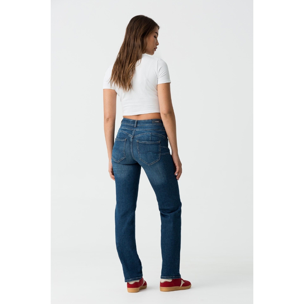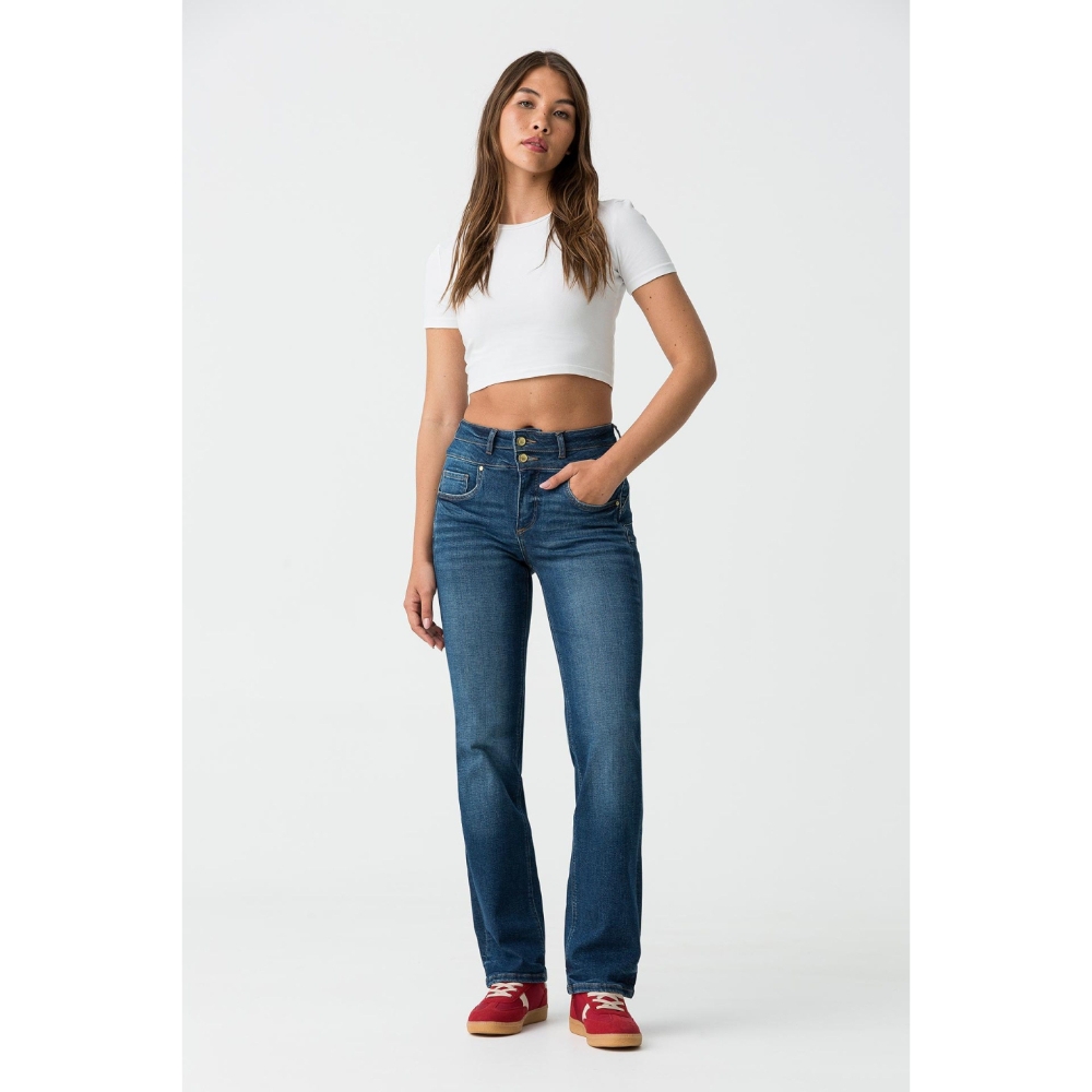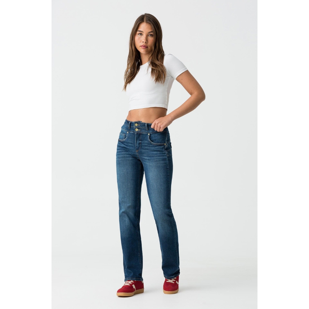 Jeans de cintura alta en azul oscuro con cinco bolsillos y efecto push-up. Cierre con cremallera y botones metálicos.99% CO 1% EL