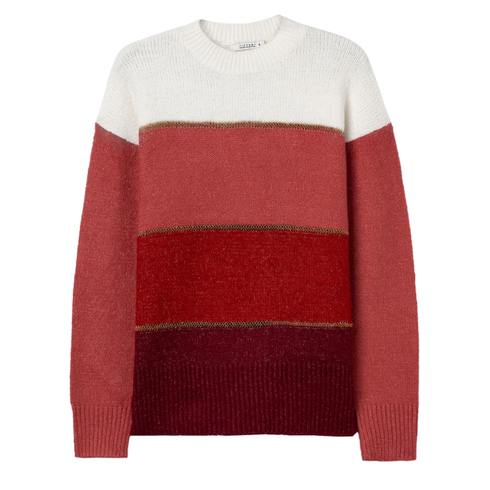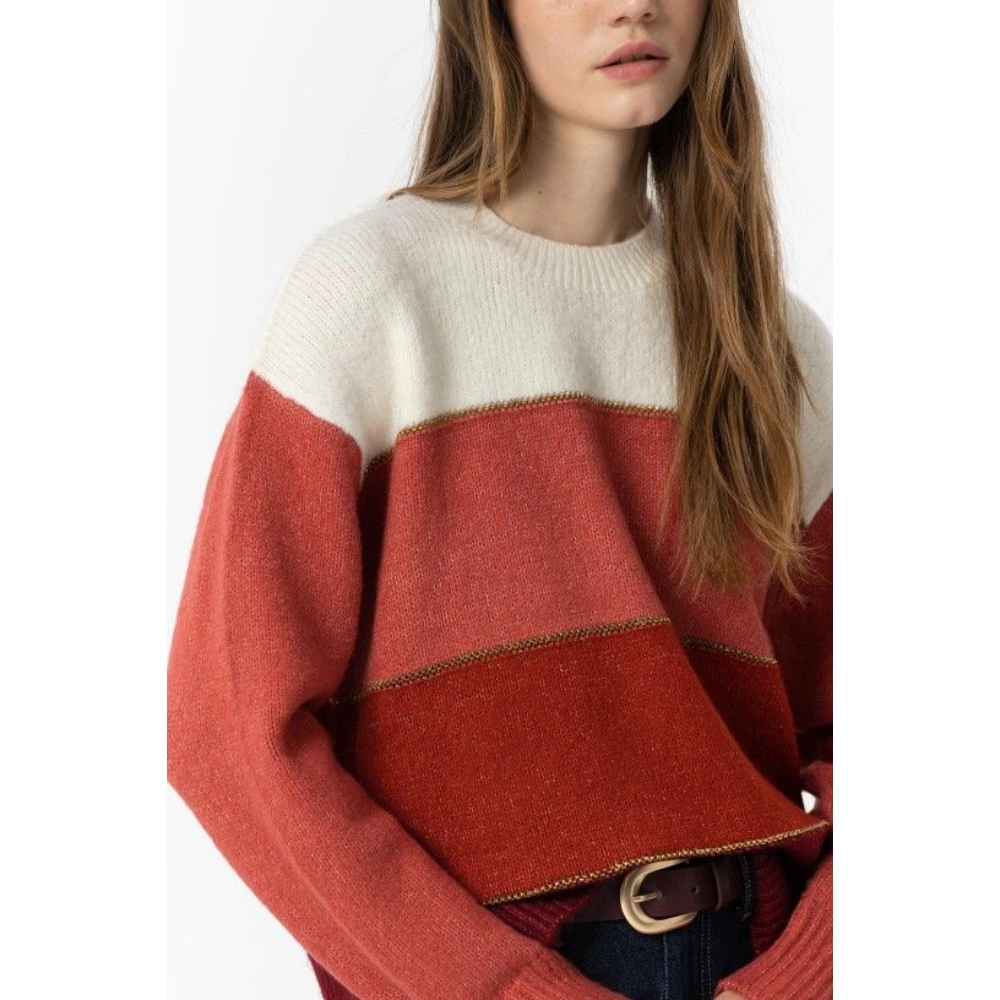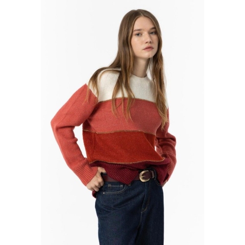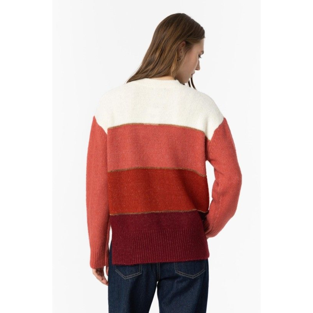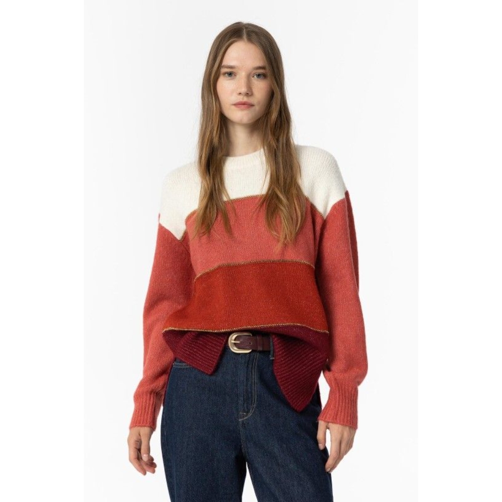 Jersey de punto de cuello redondo y manga larga. Detalles perforados. Bajo con aberturas laterales.