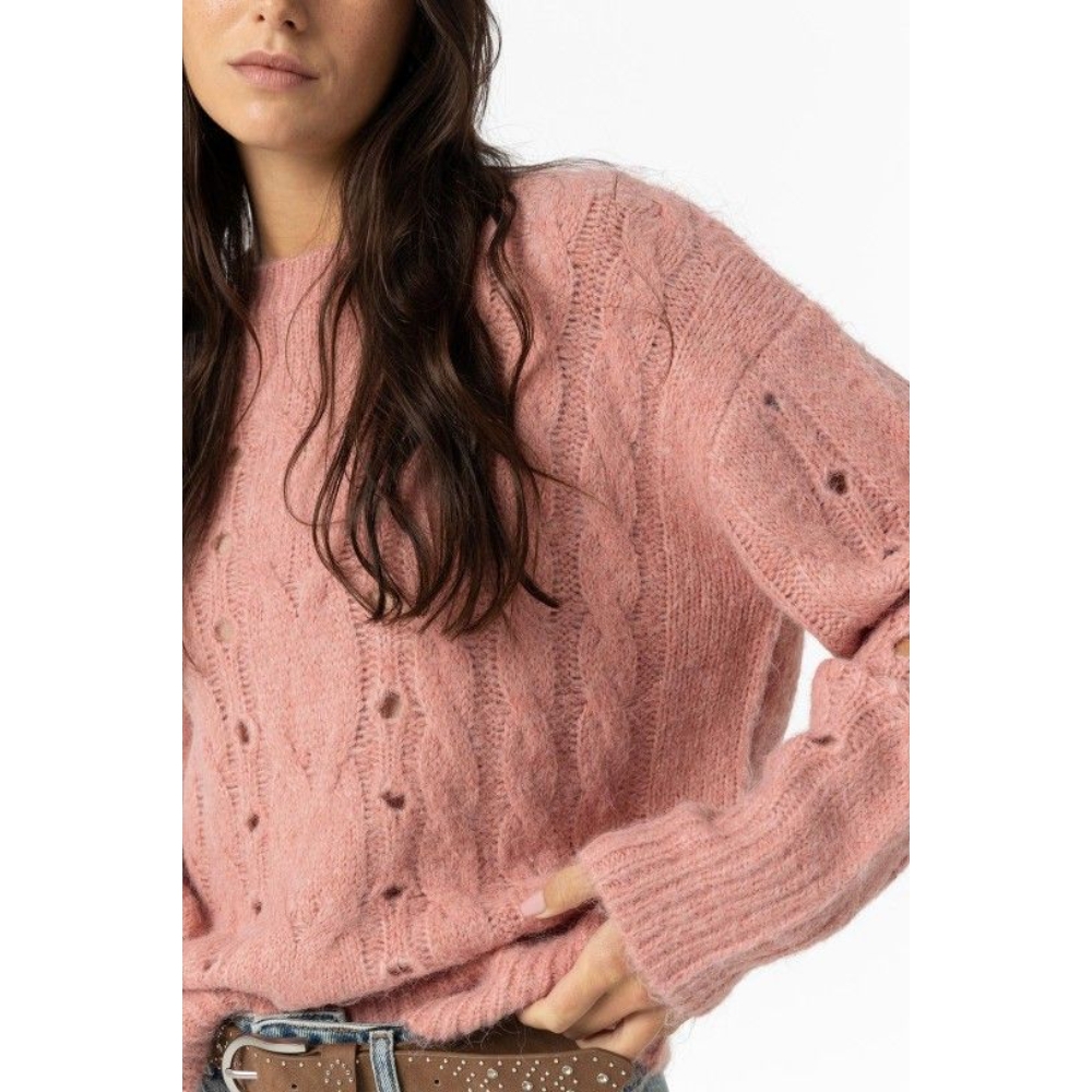 Jersey de corte relajado, con textura cardada, detalles de puntos abiertos y punto de ochos. Cuello redondo, manga larga y acabado en canalé.
