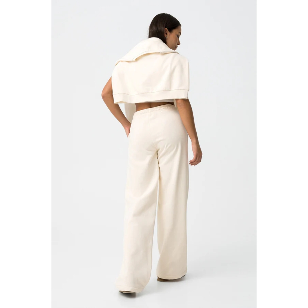 Pantalones wide leg en algodón. Cintura media con cinturilla elástica y cordón ajustable. Bolsillos laterales y pierna ancha. Detalle de bordado en el bolsillo frontal.