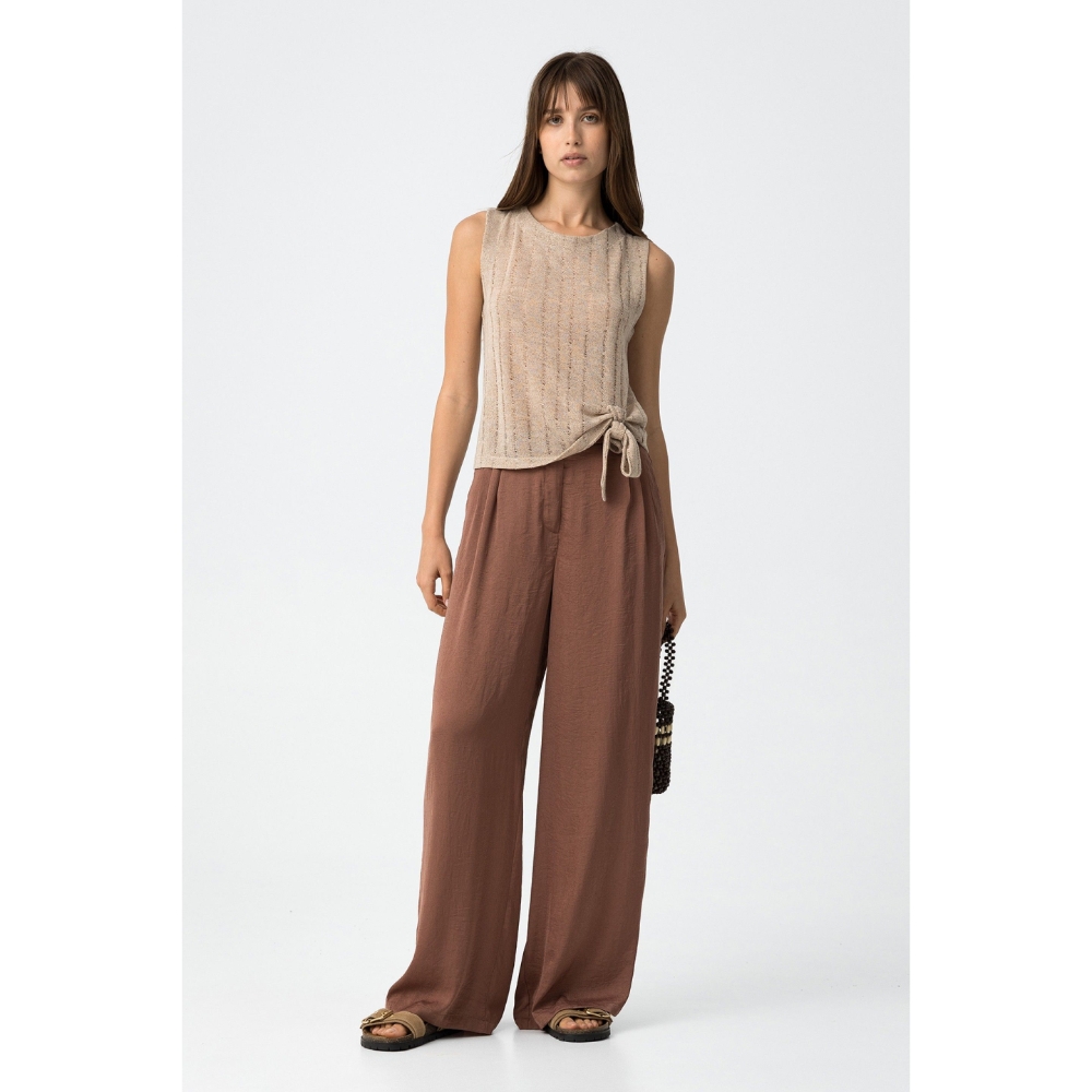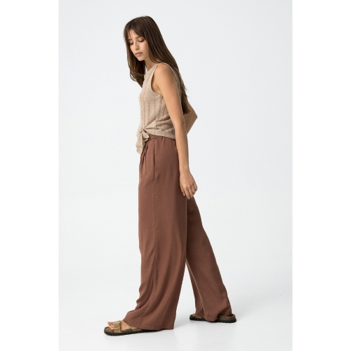 Pantalones palazzo fluidos en tono marrón con textura. Cintura elástica y bolsillos frontales.100% POLYESTER