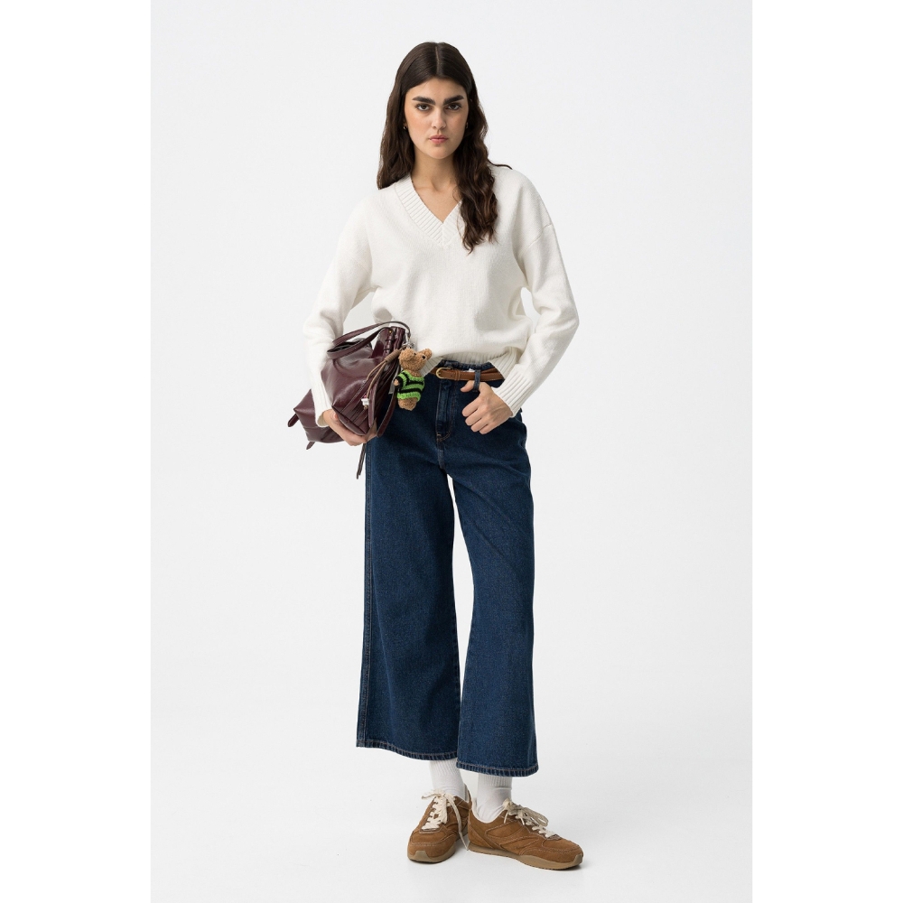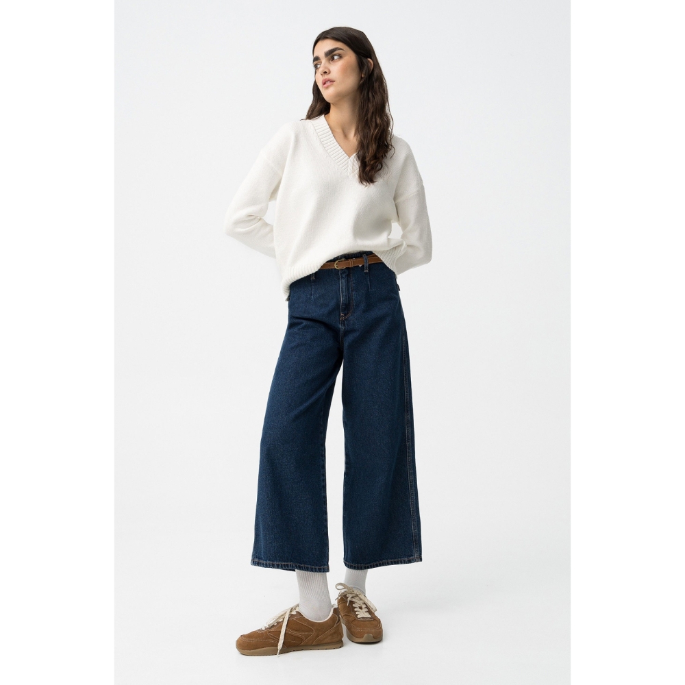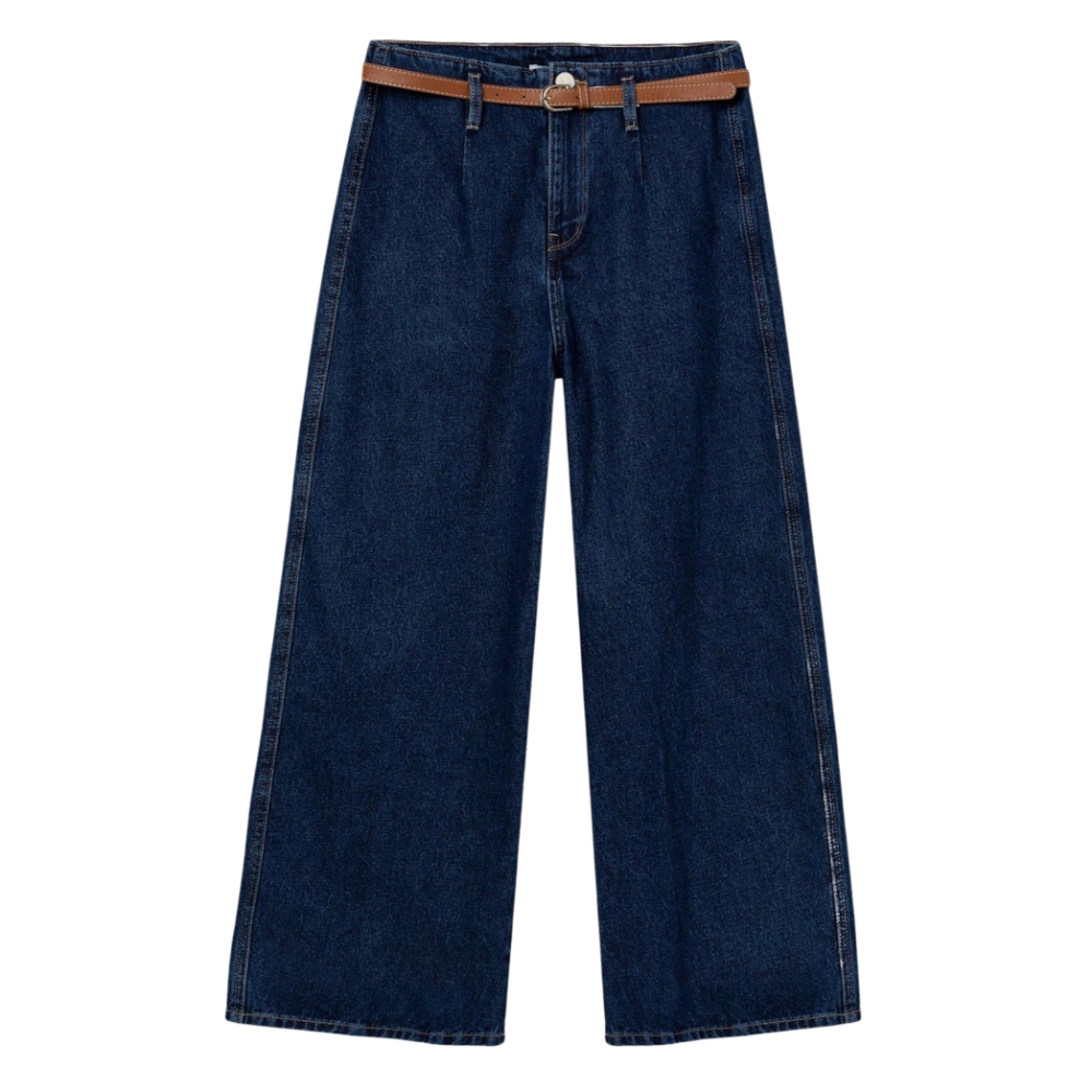 Jeans straight fit de tiro alto. Cinturón incorporado en la cintura, en denim con hebillas ajustables. Cinco bolsillos funcionales — dos delanteros, dos traseros y uno pequeño. Cierre frontal con cremallera y botón metálico.