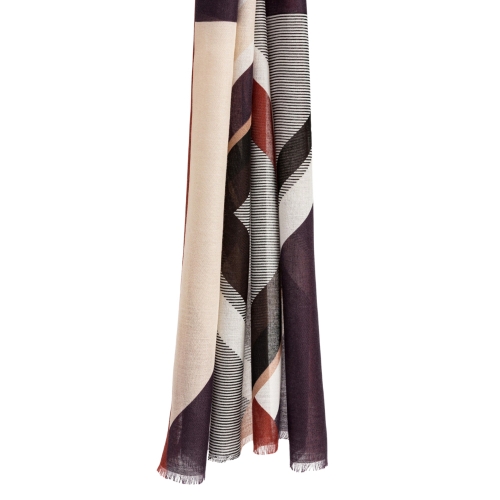 Pañuelo rectangular con estampado geométrico y acabado deshilachado.100% POLYESTER