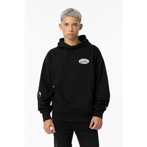 Sudadera con capucha con detalle delantero, espalda estampada y bolsillo canguro. Capucha, manga larga y acabados en canalé.