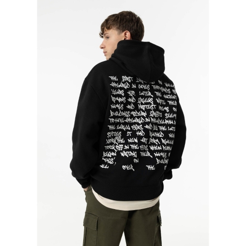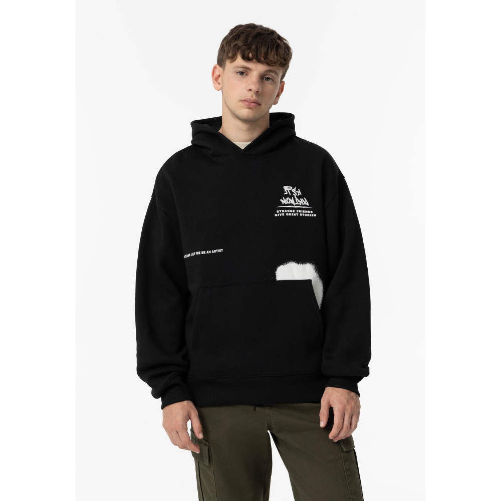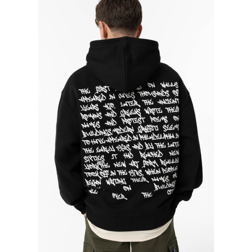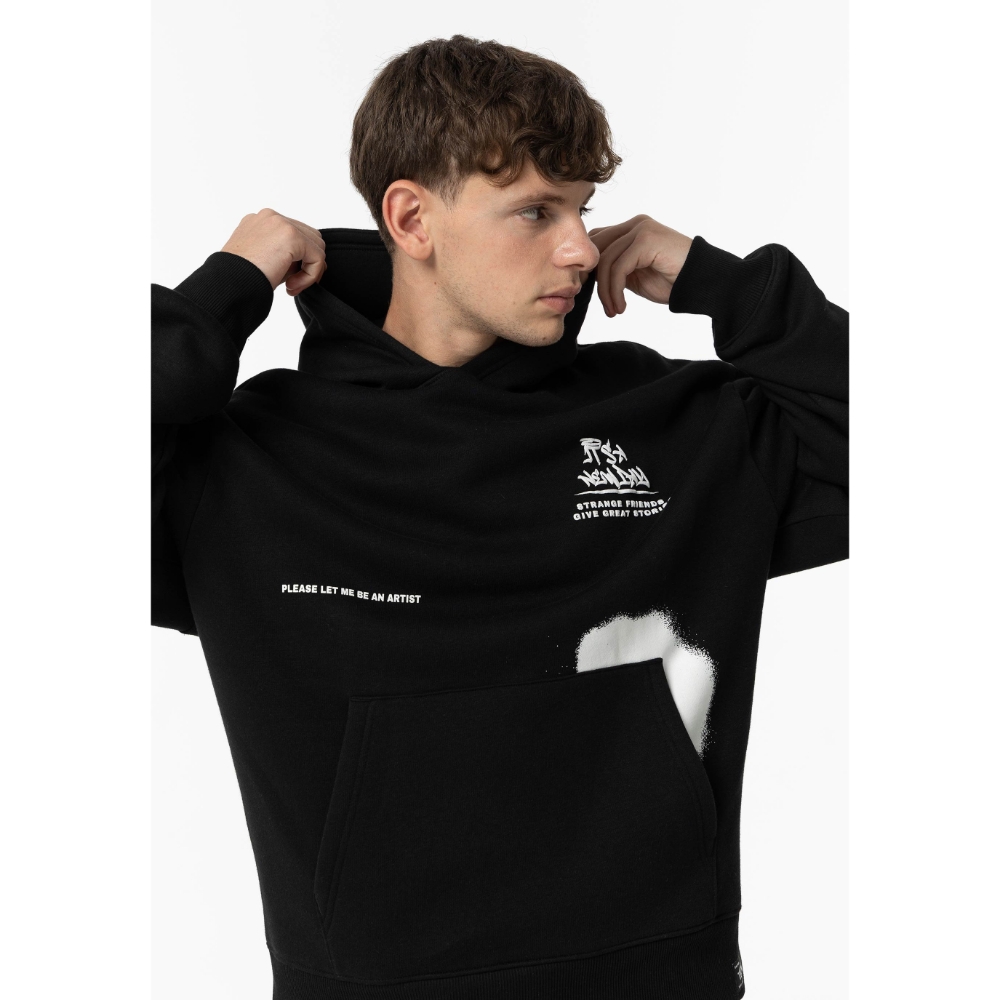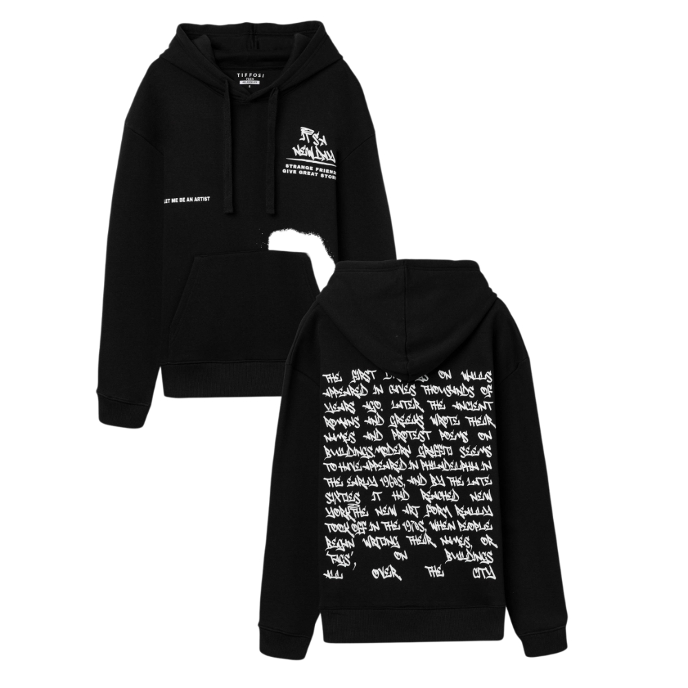 Sudadera cardada con capucha y manga larga. Estampado frontal y en espalda. Terminaciones de canalé. Bolsillo frontal tipo canguro.