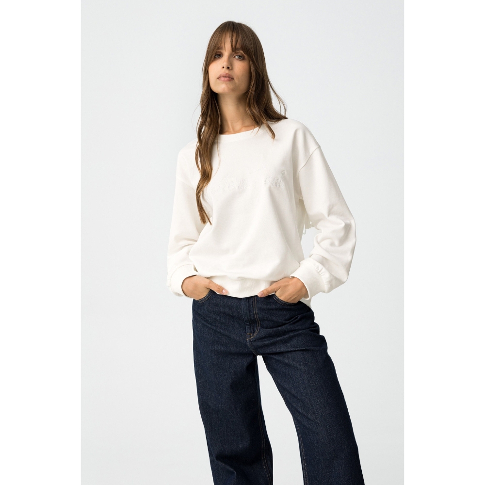 Sudadera regular fit con mensaje bordado y flecos en la espalda. Escote redondo, manga larga y acabados en canalé. Interior afelpado.80% COTTON 20% POLYESTER