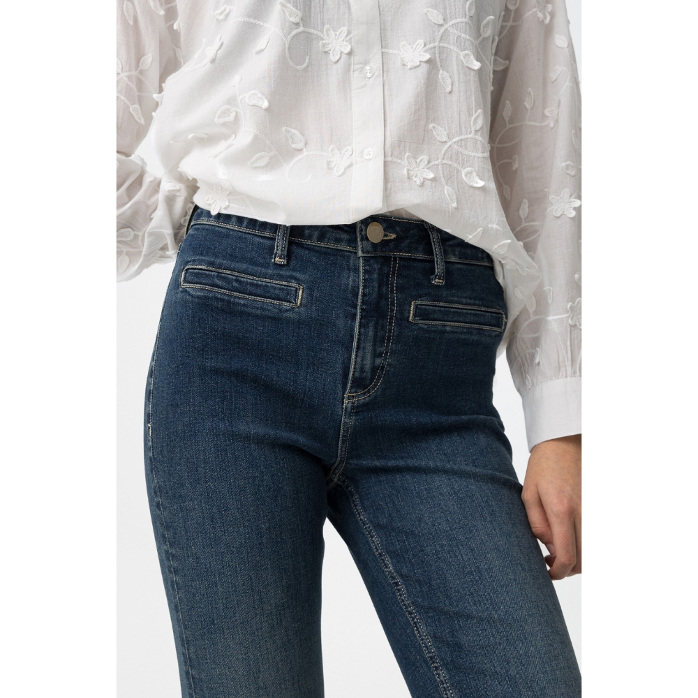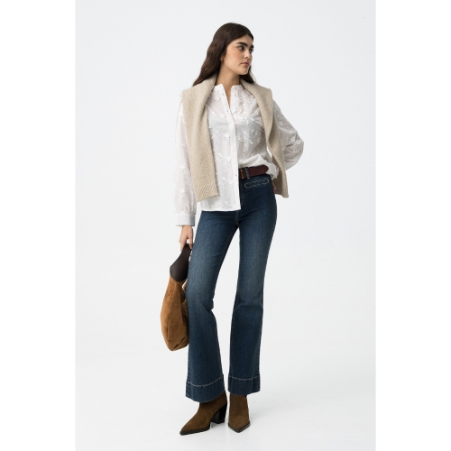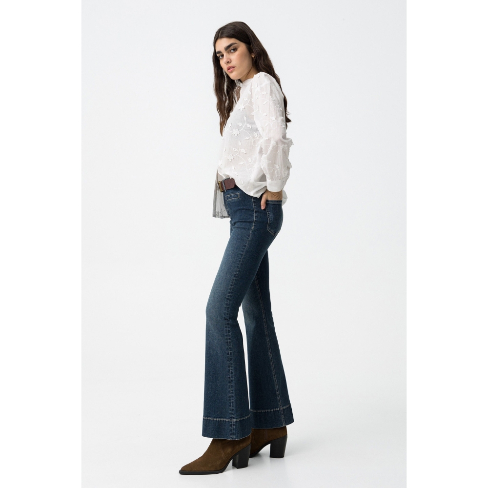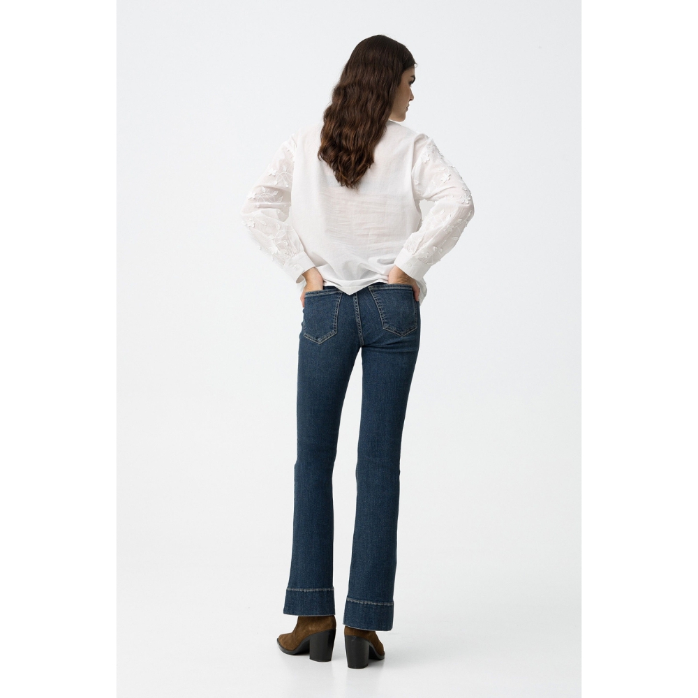 Vaqueros de corte flare en azul oscuro, con bolsillos delanteros y traseros, cierre de botón.98% COTTON 2% ELASTANE