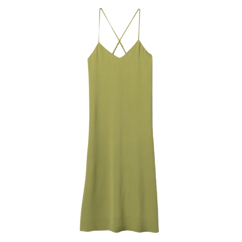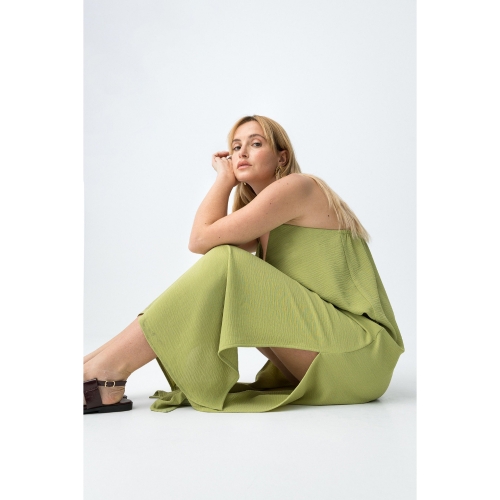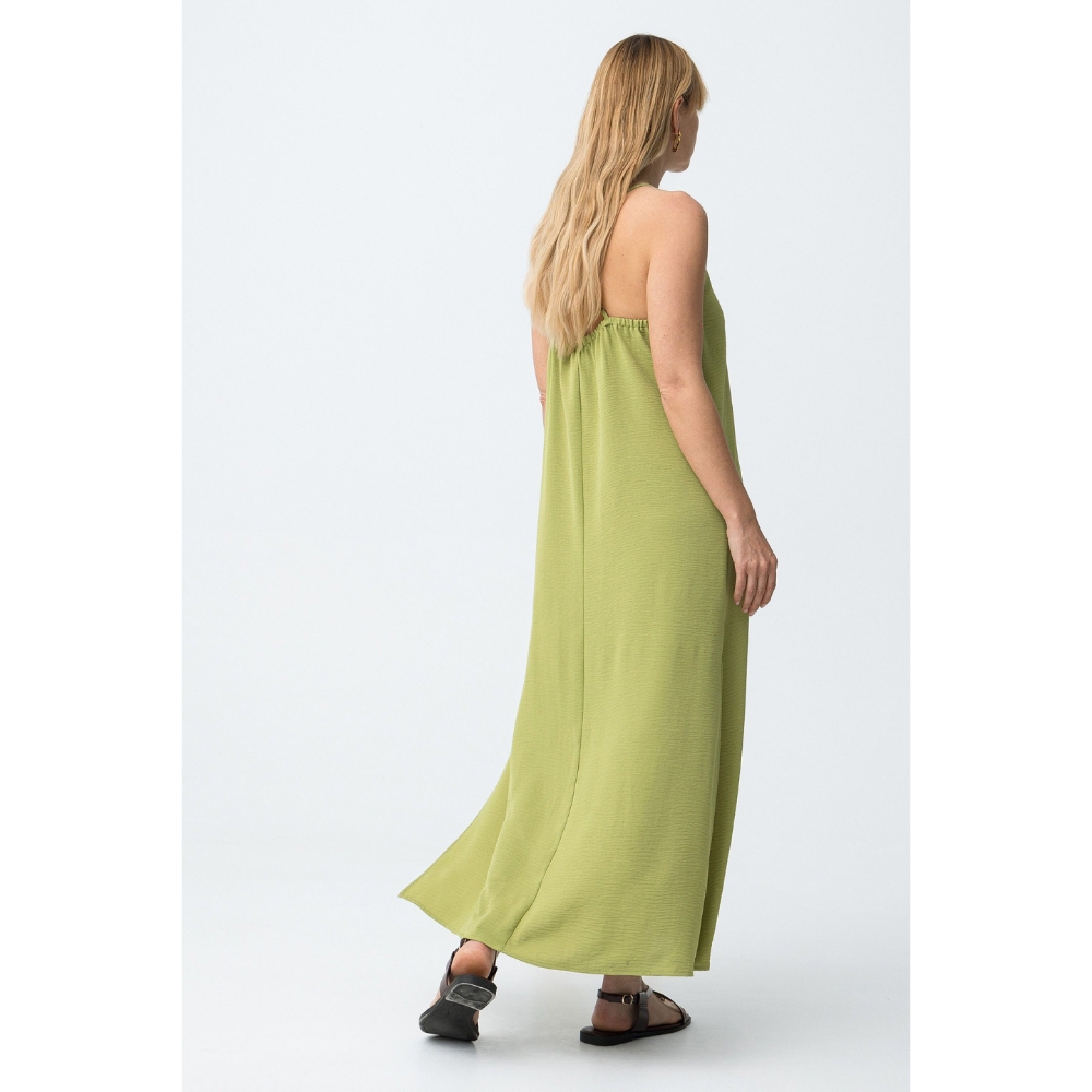 Mono oversize de color verde claro, corte amplio, tirantes finos y abertura lateral en las piernas.100% POLYESTER