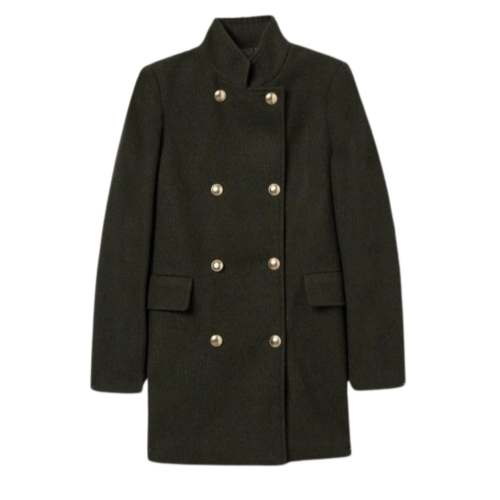 Chaqueta de manga larga y cuello subido. Bolsillos delanteros. Cierre frontal con botones dorados.