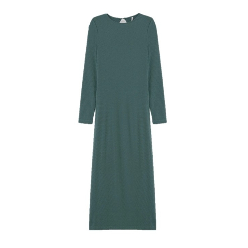 Vestido de manga larga y cuello redondo. Cierre trasero con botón. Detalle abertura y frunces ajustable lateral.