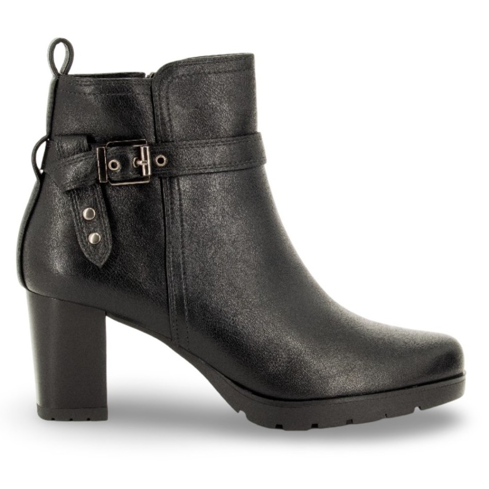 Botin con tacon alto para mujer. Fabricado en material sintético de gran calidad con cremallera lateral. Color negro