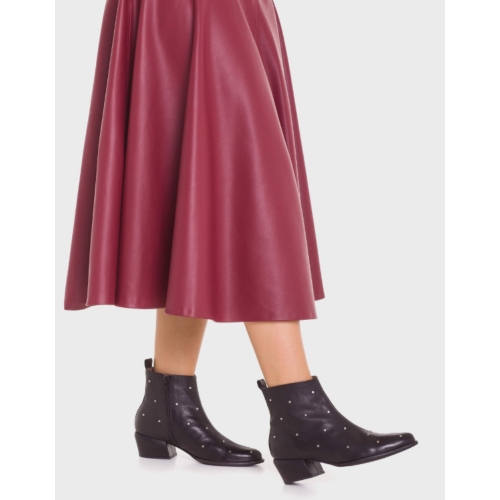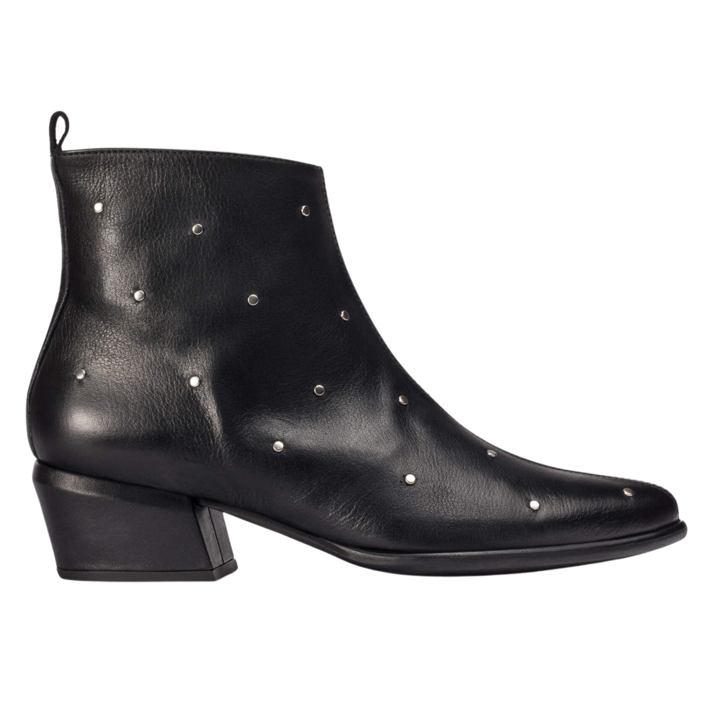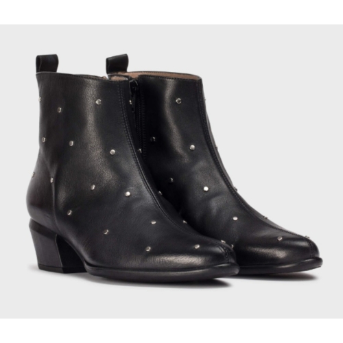 Botines FEI 02 confeccionados en piel negra con microtachas metálicas distribuidas por todo el empeine. Un diseño minimalista con inspiración western que combina líneas depuradas y una silueta estilizada con toques de carácter gracias a los detalles metálicos. Incorpora cremallera lateral interior para un ajuste cómodo y funcional, y tiradores en ambos talones del caño que refuerzan su estética urbana. El tacón de altura media aporta estabilidad sin renunciar a la sofisticación. La suela flexible aporta un extra de comodidad, combinado con la plantilla interior de MemoryGel que asegura una pisada amortiguada en cada paso. #madewithloveinSpain Wonders apoya la fabricación responsable vía LEATHERWORKINGGROUP.