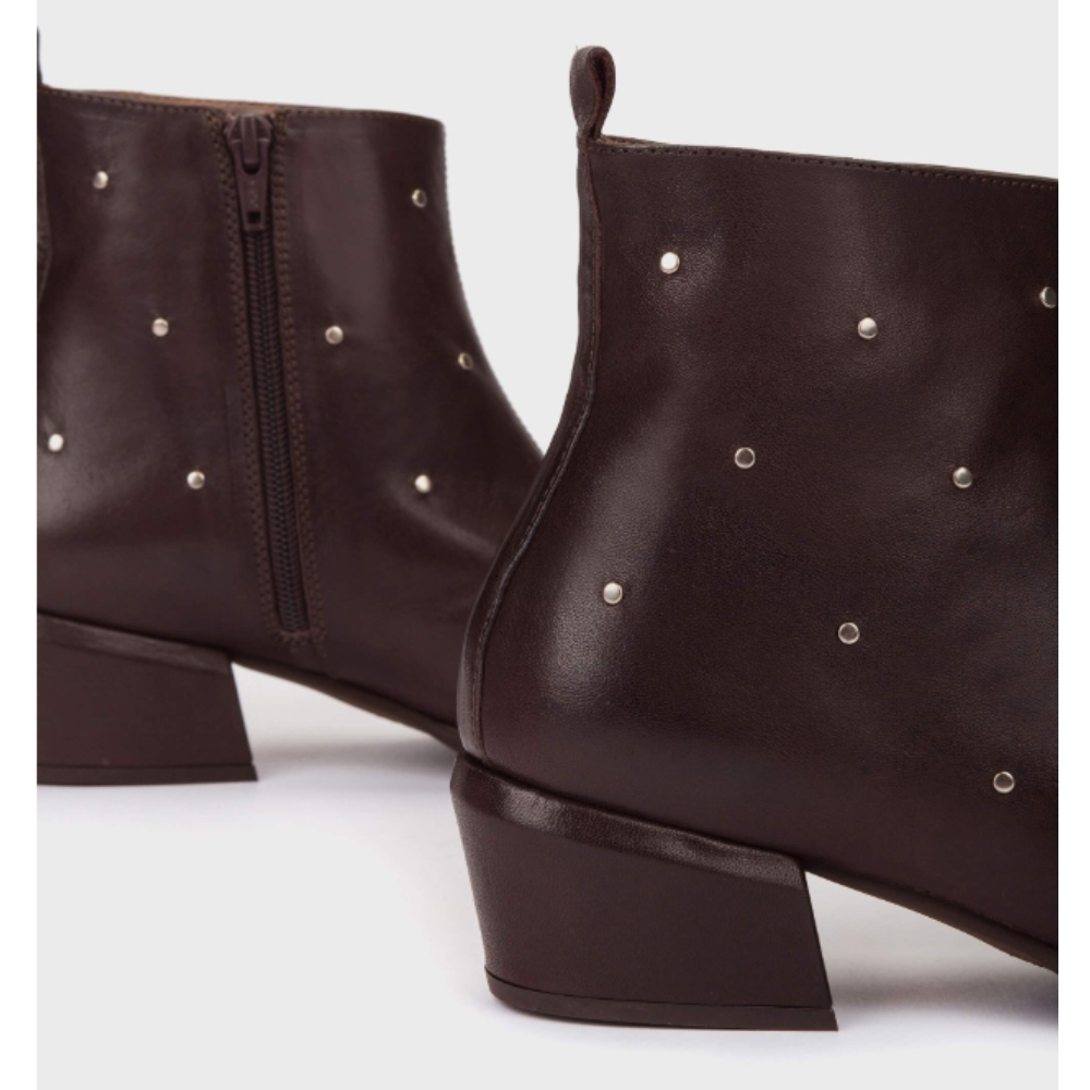 Botines FEI 02 fabricados en piel marrón con microtachas metálicas distribuidas por todo el empeine. Un diseño minimalista con inspiración western que combina líneas depuradas y una silueta estilizada con toques de carácter gracias a los detalles metálicos. Incorpora cremallera lateral interior para un ajuste cómodo y funcional, y tiradores en ambos talones del caño que refuerzan su estética urbana. El tacón de altura media aporta estabilidad sin renunciar a la sofisticación. La suela flexible aporta un extra de comodidad, combinado con la plantilla interior de MemoryGel que asegura una pisada amortiguada en cada paso. #madewithloveinSpain Wonders apoya la fabricación responsable vía LEATHERWORKINGGROUP.