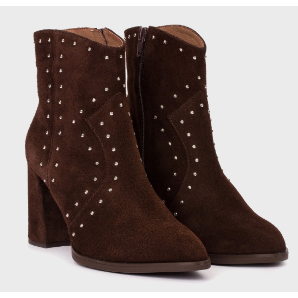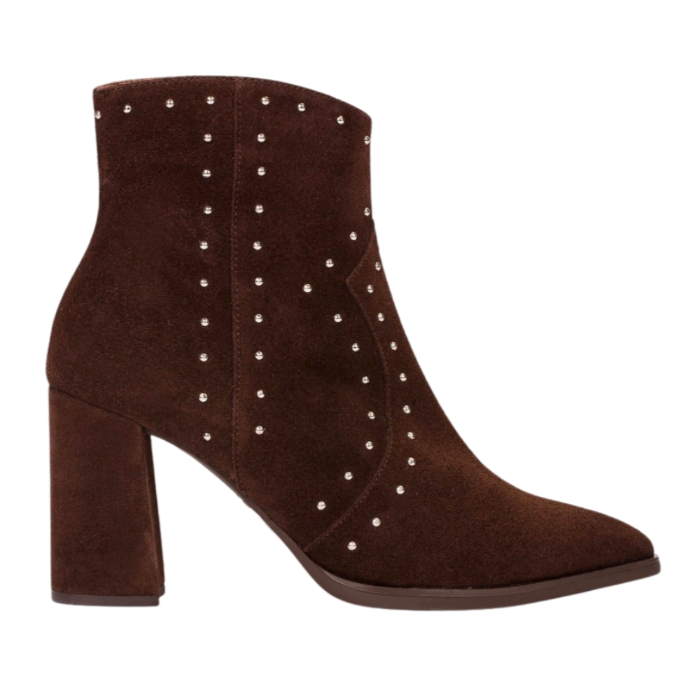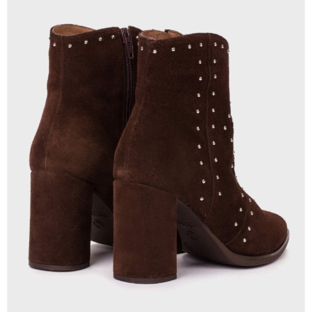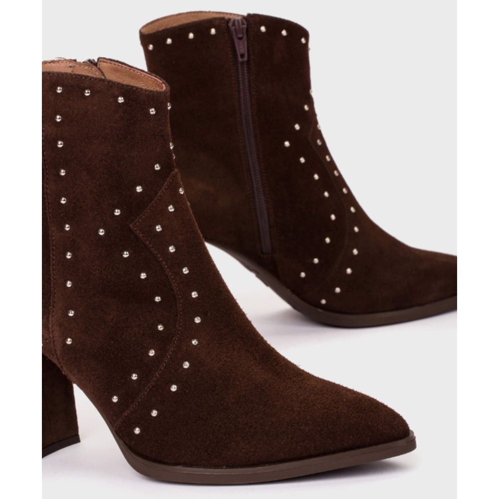 Botines AURORA 31 fabricadas en piel serraje color marrón. El corte minimalista y detalle de apliques metálicas, se realza con una costura central que recorre el empeine y se funde con el escote asimétrico, estilizando la silueta. Incorpora cremallera lateral interior para facilitar el calce y tacón ancho de altura media-alta, revestido a tono. otas AURORA 32 de tacón en piel negra, un modelo clásico, elegante y atemporal que combina estilo y comodidad. Fabricadas en piel lisa de alta calidad, presentan un diseño con punta afilada y tacón cuadrado que aporta estabilidad sin renunciar a la sofisticación. Su piso aporta un extra de comodidad, combinado con la plantilla interior de MemoryGel que asegura una pisada amortiguada. #madewithloveinSpain. Wonders apoya la fabricación responsable vía LEATHERWORKINGGROUP..
