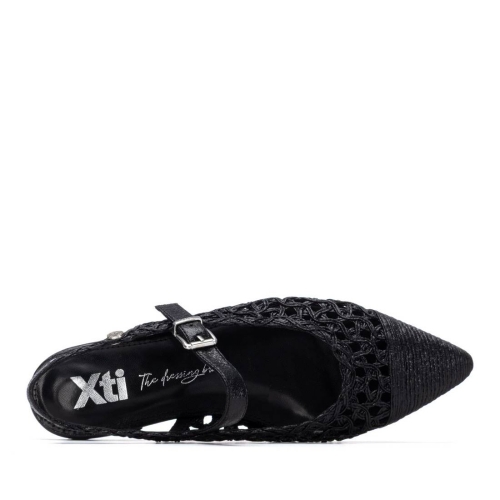Bailarina de mujer, de la marca Xti. Modelo plano y cómodo, fabricado en material textil con efecto metalizado, ideal para aportar un toque de brillo a tus looks estivales. Su diseño destaca por un bonito trenzado en relieve, que forma figuras decorativas muy originales y femeninas.  Cuenta con una correa con hebilla en el empeine y una tira adicional que sujeta el talón, ofreciendo un ajuste seguro y elegante. El tacón bajo con acabado metalizado aporta sofisticación sin perder confort. Además, incorpora una suela antideslizante, perfecta para disfrutar de cada paso con seguridad. Ideal para looks diarios con un punto chic. Este modelo ha obtenido el certificado vegano por la organización mundial PETA (Organización de los derechos de los animales).
