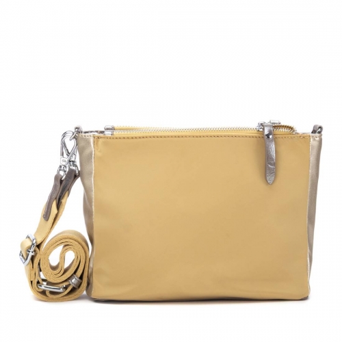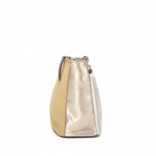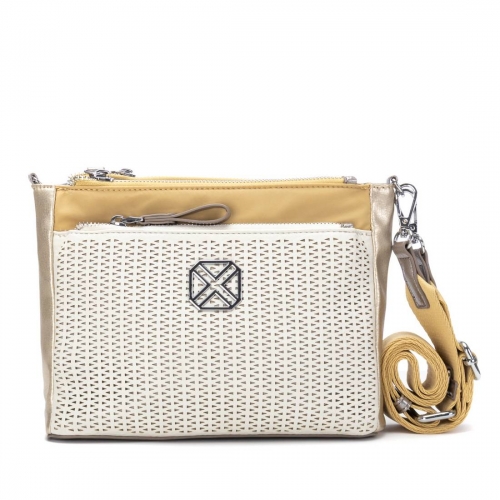 Bolso bandolera de la marca XTI, confeccionado en material  que imita la piel combinado perfectamente con un textil. Incorpora cierre superior con cremallera para mayor seguridad y comodidad