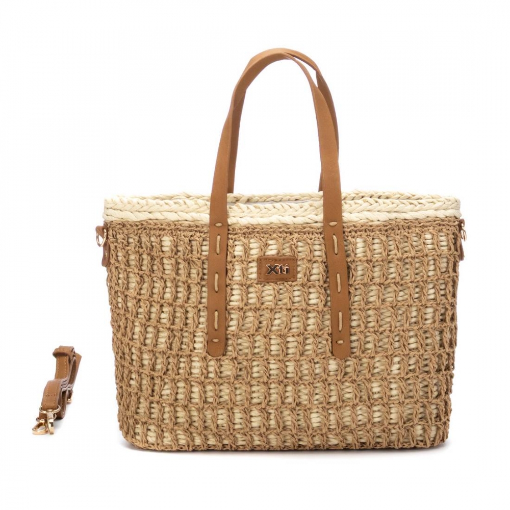 Añade un toque natural a tus looks con este bolso de hombro XTI para mujer. Fabricado en material efecto rafia, combina estilo y frescura. Su cierre con cremallera protege tus pertenencias