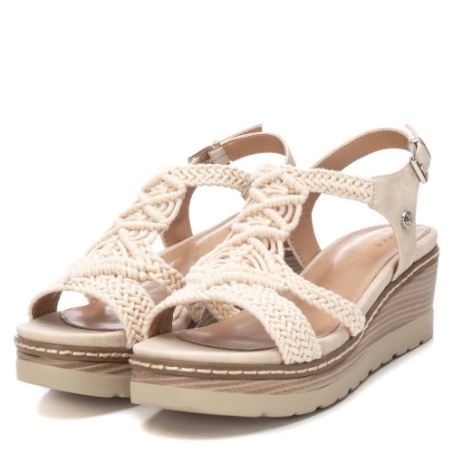 Sandalia de mujer con cuña, de la marca Xti. Diseño de nudos de macramé. Cierre con hebilla metálica para facilitar el ajuste. Cuña de 6 cm con suela de goma antideslizante