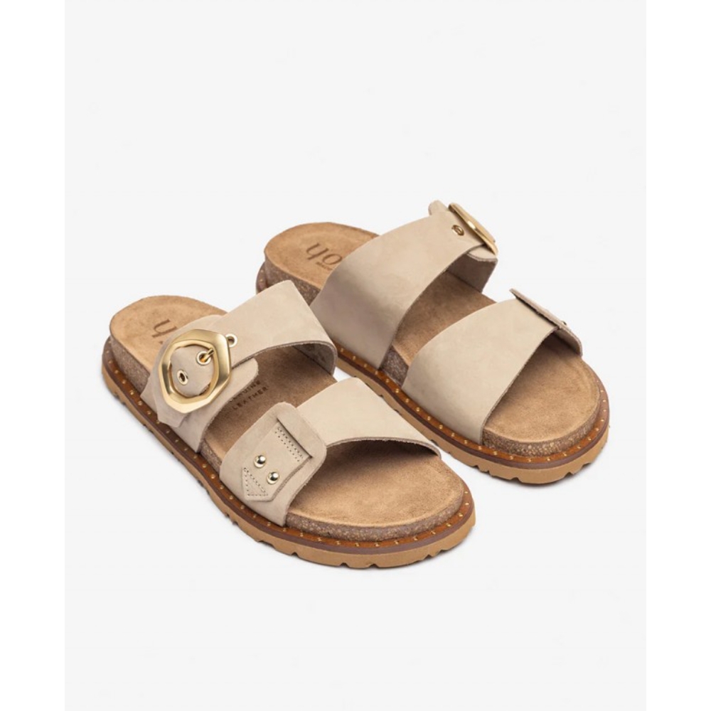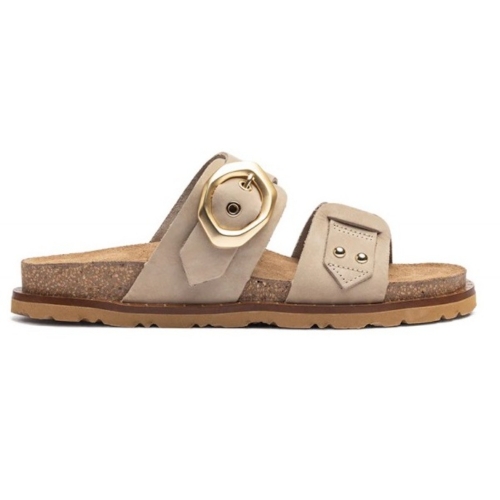 Sandalia de pala Yokono Bolus 254 para mujer en un suave color beige. Diseño casual con hebilla y suela plana de 2 cm, elaborada en piel de nobuck de primera calidad.