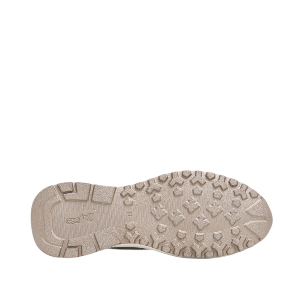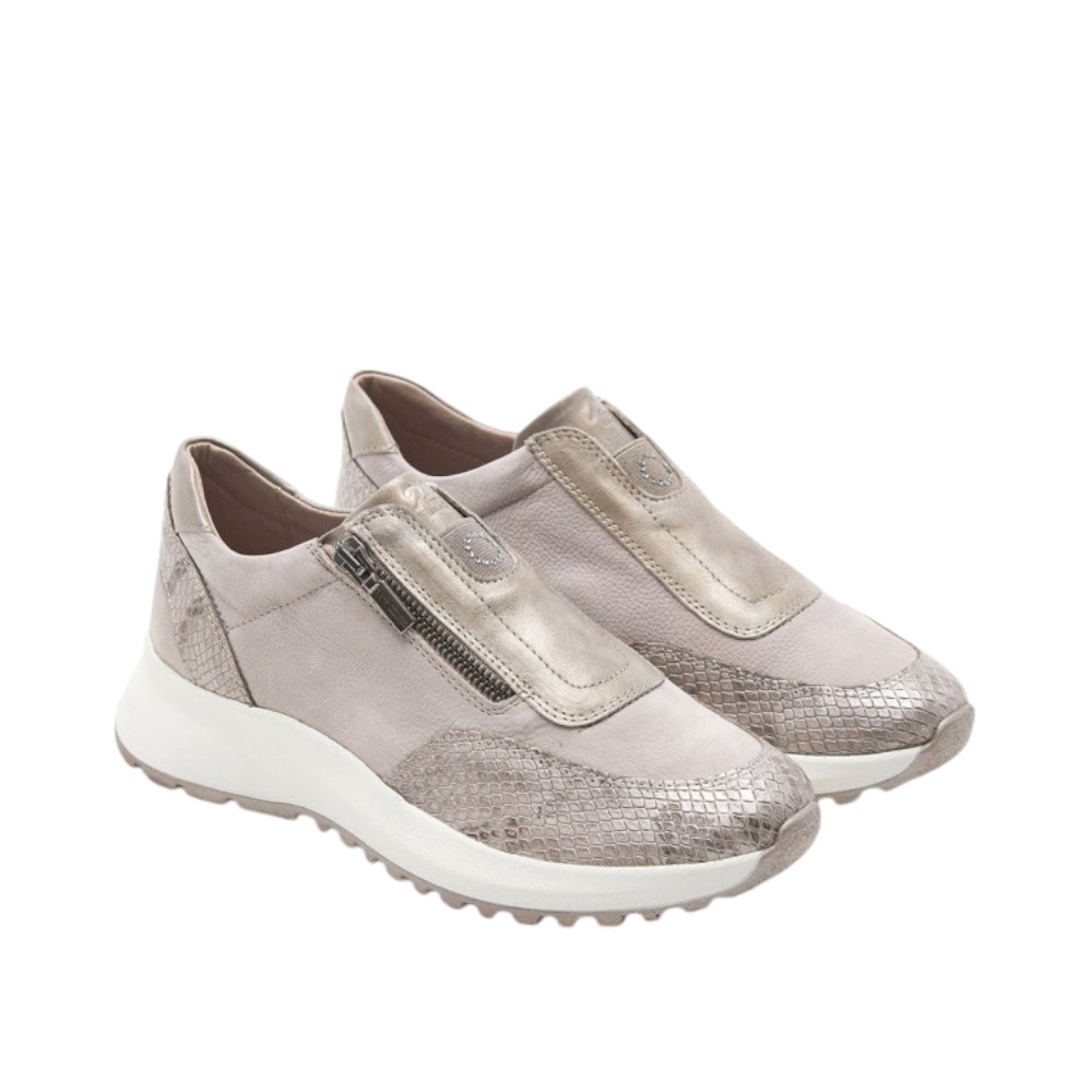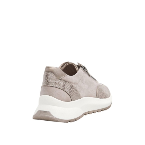 Sneaker mujer color taupe combinada en pieles a contraste con cierre de cremallera lateral y elástico. Detalle en pedrería, costuras vistas y puntera redonda con refuerzo. Suela dentada bicolor en PU alta calidad con 5 cm de altura, plantilla extraíble incluida y tecnología de alto confort. Un modelo urbano para vestir looks casual.