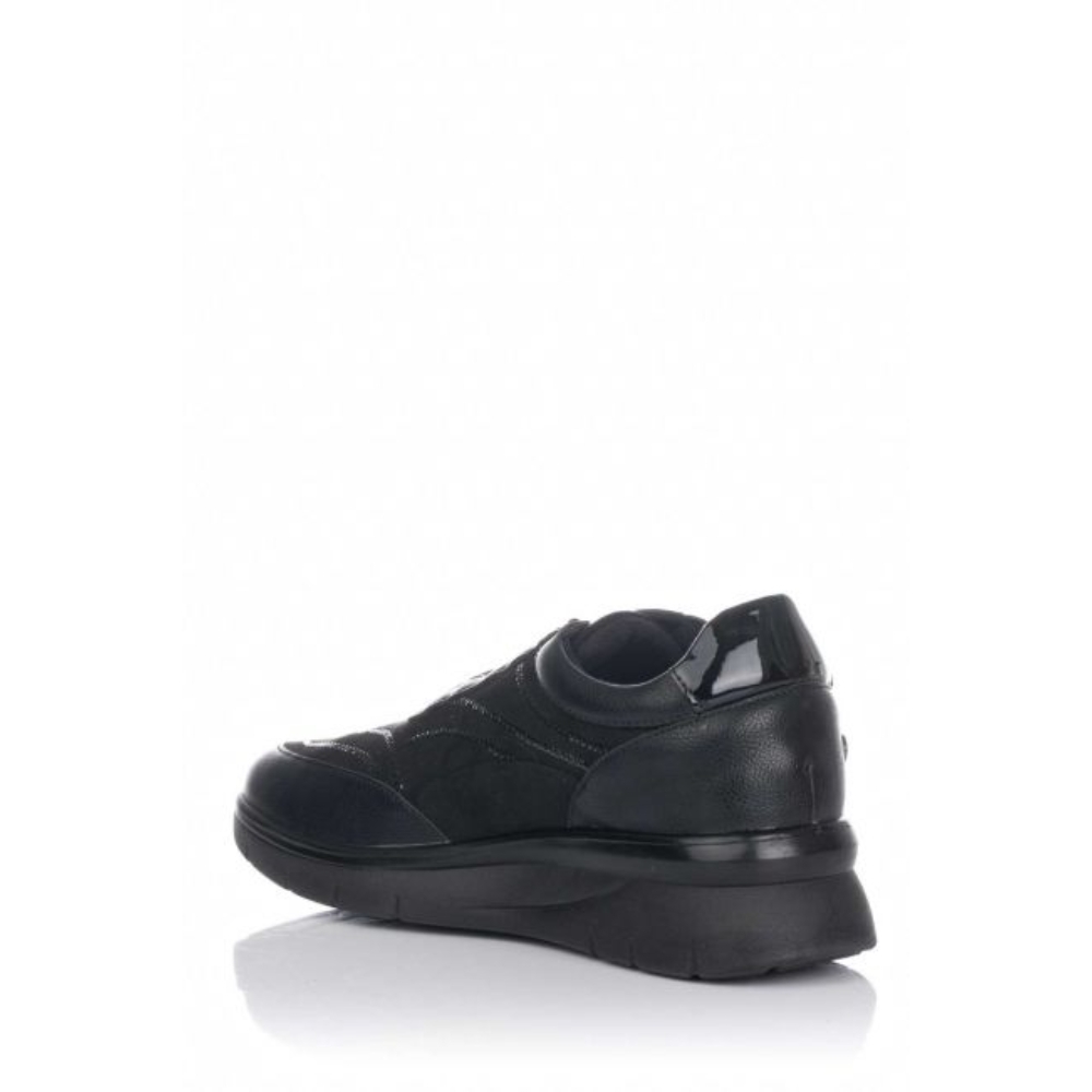 Zapato estilo confort con gomas elásticas de la marca Amarpies para mujer. Fabricado en material sintético con brillantes. Color negro