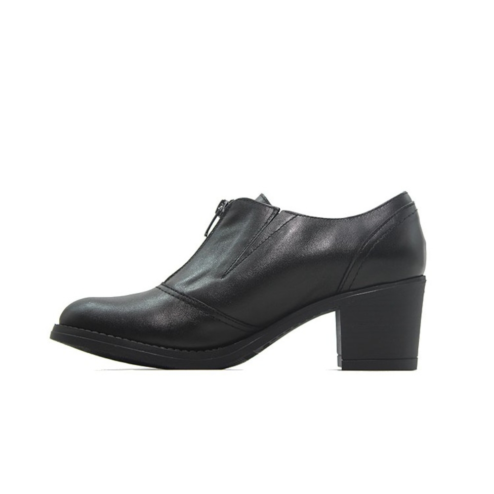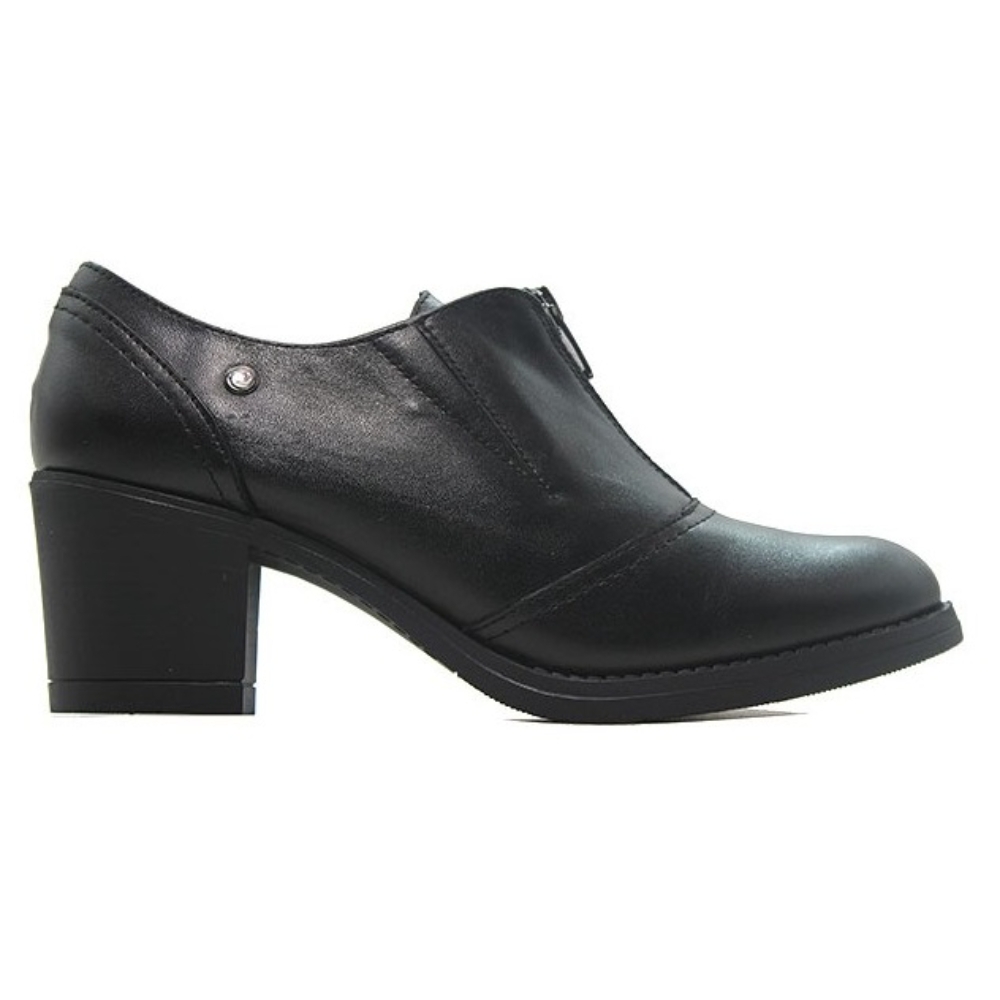 Zapato abotinado con tacón medio de la marca Rivera para mujer. Fabricado en piel de gran calidad con tacón y plataforma de goma, cremallera en el empeine. Color negro